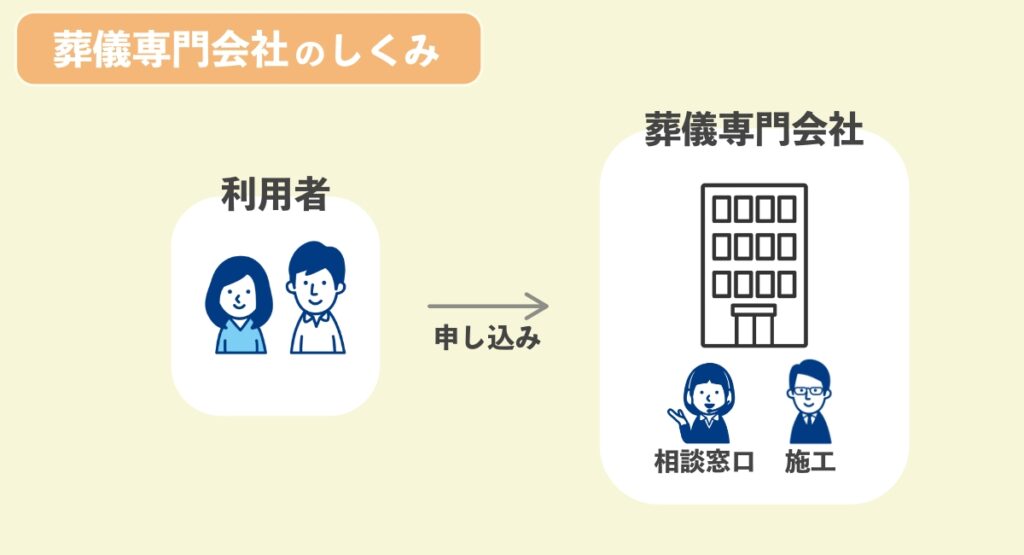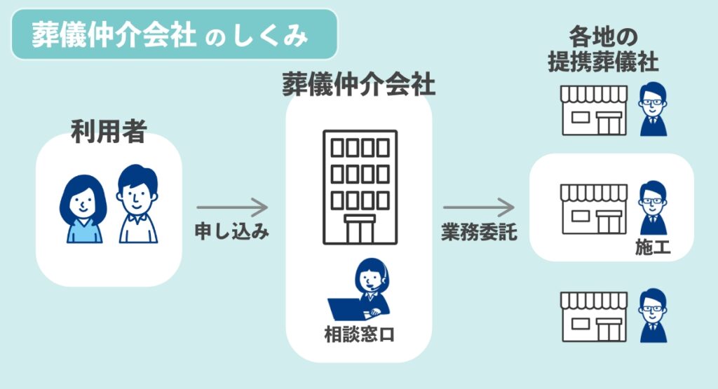 葬儀社には、すべてを自社で行う「葬儀専門会社」と提携葬儀社に業務を委託している「葬儀仲介会社」の2つが存在します。