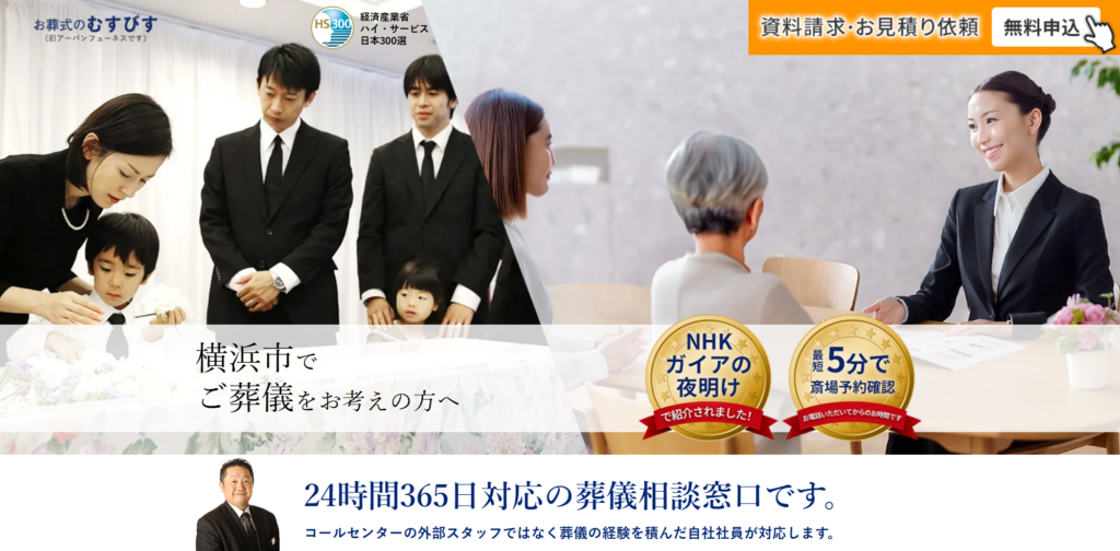 横浜市戸塚斎場でも圧倒的な相談件数と葬儀実績がある「お葬式のむすびす」は、サービス業界でお手本となる優良企業として「経済産業省ハイ・サービス日本300選」に選出されています。(その他には星野リゾートや無印良品の良品計画など)品質の良さは折り紙付きです。