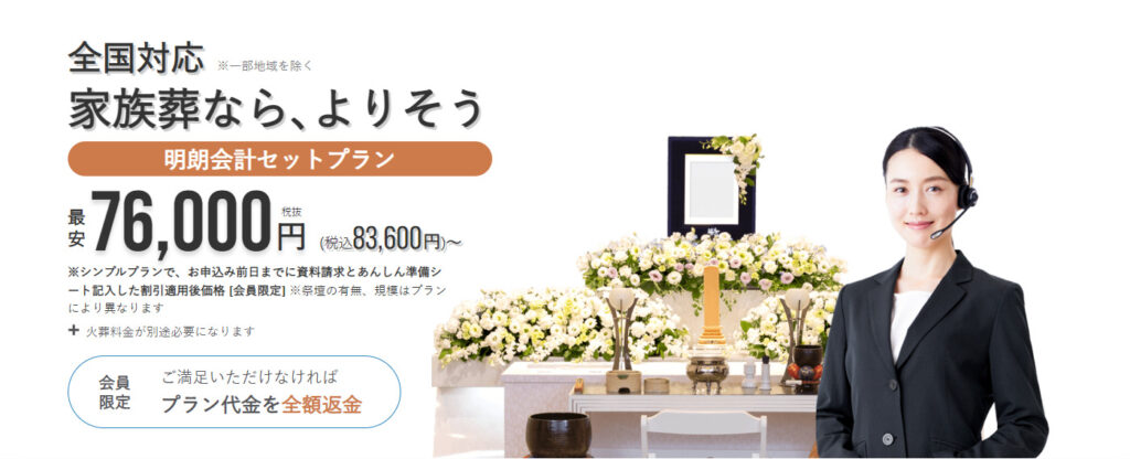 シンプルな葬儀をお考えの方は、低価格で返金保証付きのよりそうお葬式を検討してみてはいかがでしょうか。